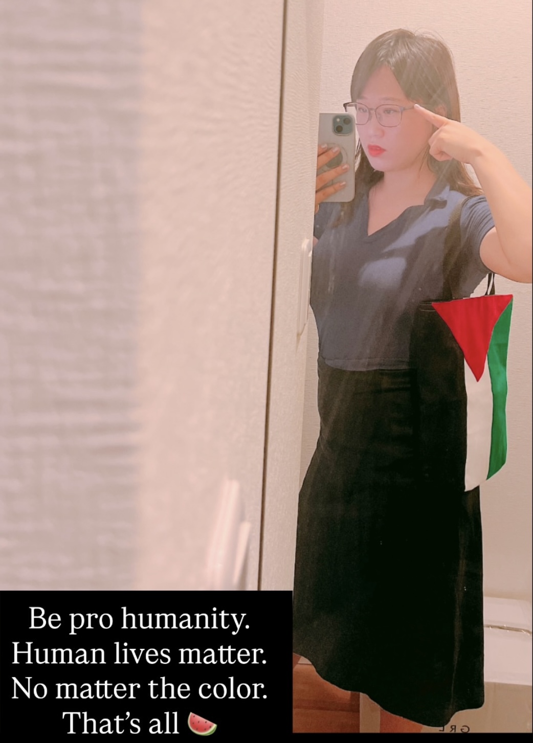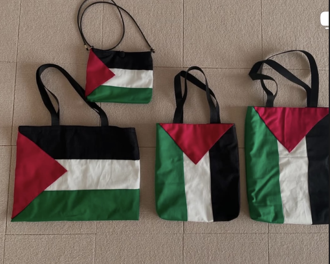 'I'm making Palestinian flag 🇵🇸 bags. I charge shipping and material costs (400 yen for the large bag, 300 yen for the medium/pochette bag), and send them as donations to those who wish to receive them.'